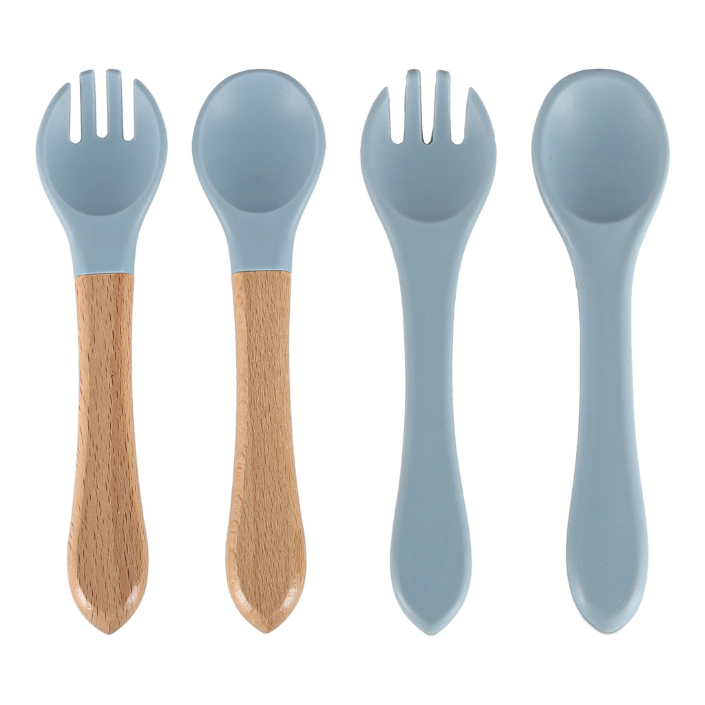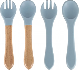 Podesiva silikonska podbradna marama s dubokim džepom hvata većinu ostataka i štiti odjeću. Dva seta pribora (silikonski i s drvenom drškom) podržavaju različite faze učenja držanja i zahvaćanja hrane. Šalica s poklopcem i slamkom pomaže vježbati samostalno pijenje bez nepotrebnog prolijevanja.