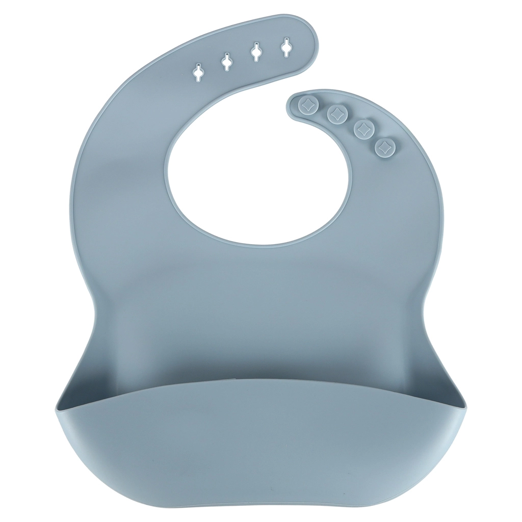 Meka silikonska podbradna marama s višerazinskim kopčanjem raste s djetetom. Duboki džep hvata mrvice i tekućine, pa odjeća ostaje čista, a čišćenje je brzo.