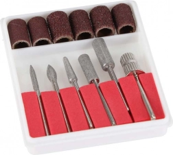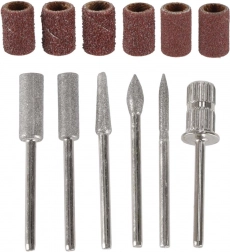 • Bogata oprema: 6 metalnih freza (šiljata, valjkasta, stožasta, kugličasta, igličasta, trn za brusne prstenove) + 6 brusnih navlaka različite granulacije.