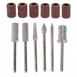 - Bogata oprema: 6 metalnih freza (šiljata, valjkasta, stožasta, kugličasta, igličasta, trn za brusne prstenove) + 6 brusnih navlaka različite granulacije.