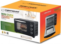 Mini pećnica ESPERANZA Napoli spaja kompaktne dimenzije s maksimalnom snagom za svakodnevno kuhanje i pečenje. Cirkulacija vrućeg zraka osigurava ravnomjernu raspodjelu topline, ražanj je idealan za sočnu piletinu i pečenke, a pet radnih načina pokriva sve od hrskave pizze do zapečenih jela. Dvostruko staklo vrata s zračnim razmakom poboljšava toplinsku izolaciju i sigurnost.
