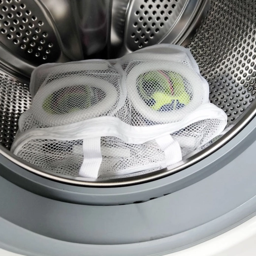 Praktična mrežasta vrećica za pranje obuće. Savršeno štiti obuću od oštećenja tijekom pranja u perilici rublja. Opremljena je zatvaračem na patentni zatvarač i praktičnim petljama koje omogućuju vješanje cipela do potpunog sušenja.