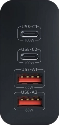 - USB-C1/USB-C2: 5V/3A, 9V/3A, 12V/3A, 15V/3A, 20V/5A (maks. 100 W); USB-A1/USB-A2: 4,5V/5A, 5V/4,5A, 9V/3A, 12V/3A, 20V/3A (maks. 60 W); Kombinacije: USB-C1+USB-C2: 60W+60W / 87W+30W (AUTO); USB-C1+(USB-A1/USB-A2): 87W+30W; USB-C2+(USB-A1/USB-A2): 87W+30W; USB-C1+USB-C2+USB-A1+USB-A2: 65W+30W+9W+9W