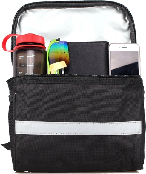 Prostrana torba za bicikl za upravljač, izrađena od izdržljivog i lako čistivog vodootpornog poliestera. Iznimno korisna na dužim i kraćim biciklističkim izletima. Torba je opremljena prostranim glavnim pretincem, još 2 bočne džepove i pretincem za karte. Torba također ima reflektirajuće elemente koji povećavaju našu sigurnost i vidljivost nakon sumraka. Torba se pričvršćuje na upravljač pomoću traka s čičkom.
