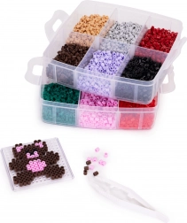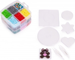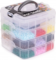 Sadržaj pakiranja: do 9000 perlica u mnogim bojama, 6 podloga (krug, kvadrat, zvijezda, srce i dr.), 2 pincete, papiri za peglanje, dizajnerski predlošci i prostrani organizator s pretincima. Zahvaljujući nasloživoj kutiji sve je pregledno posloženo i spremno za novo stvaranje kod kuće i na putu.