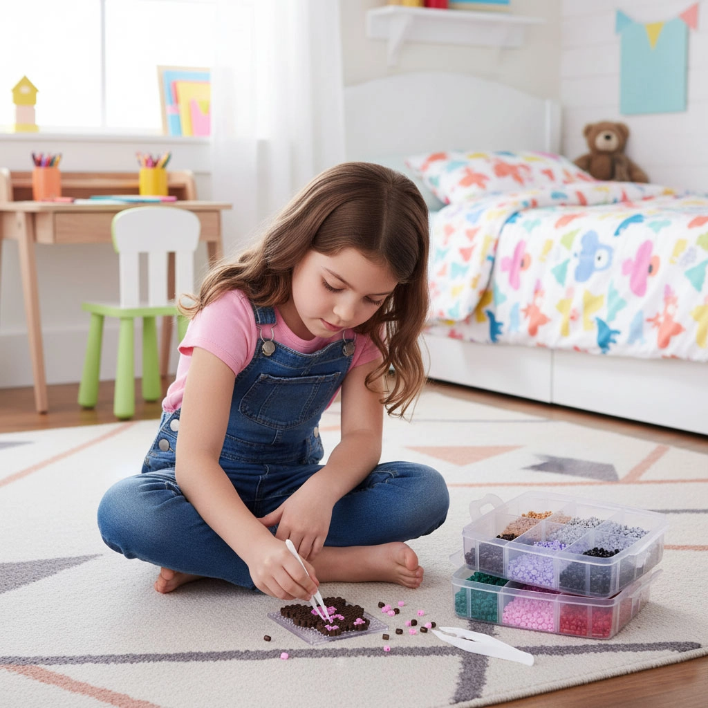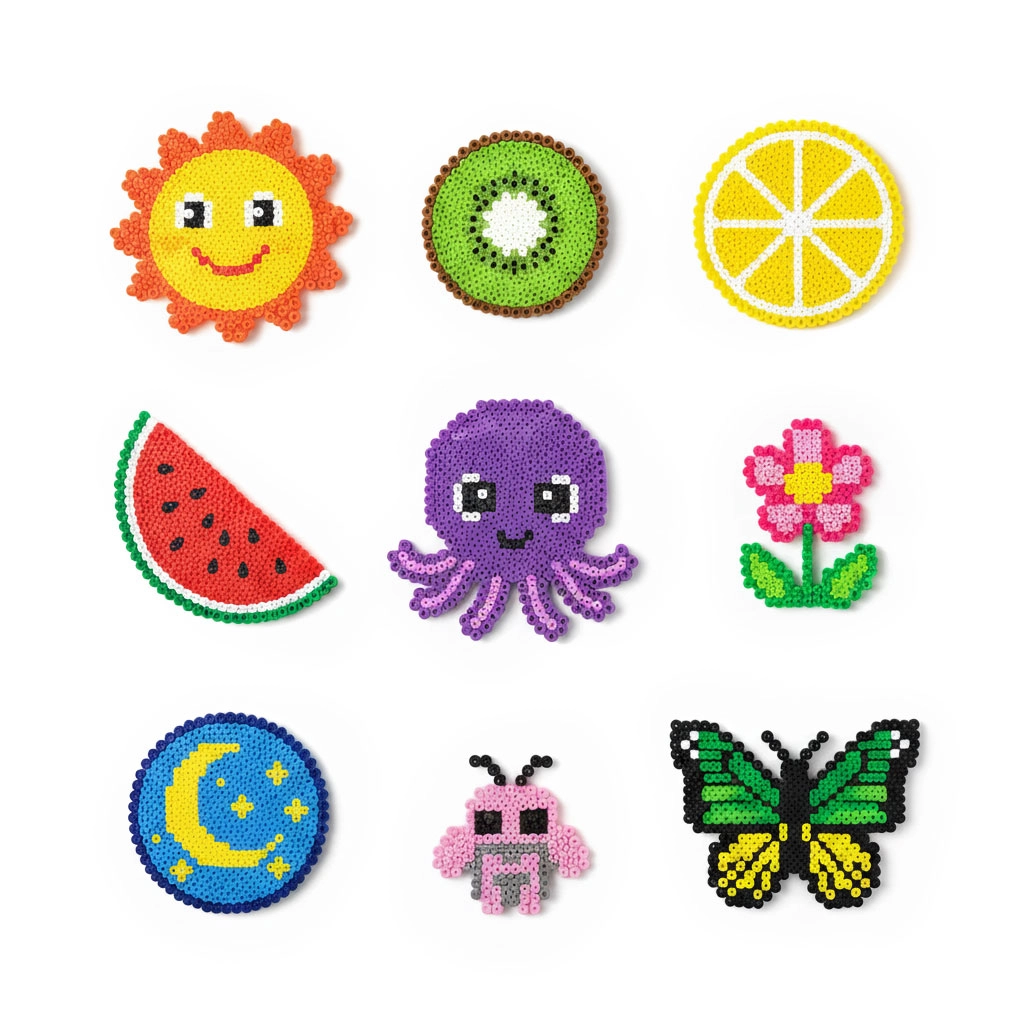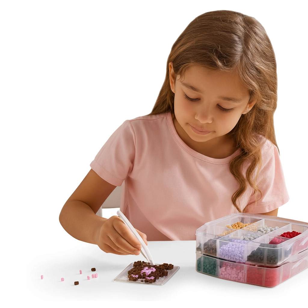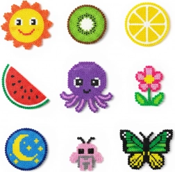 Velika zaliha perlica u širokoj paleti boja omogućuje djeci slaganje životinja, simbola, ukrasa i “pixel art” sličica – od jednostavnih motiva do razrađenih uzoraka.