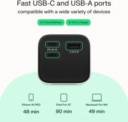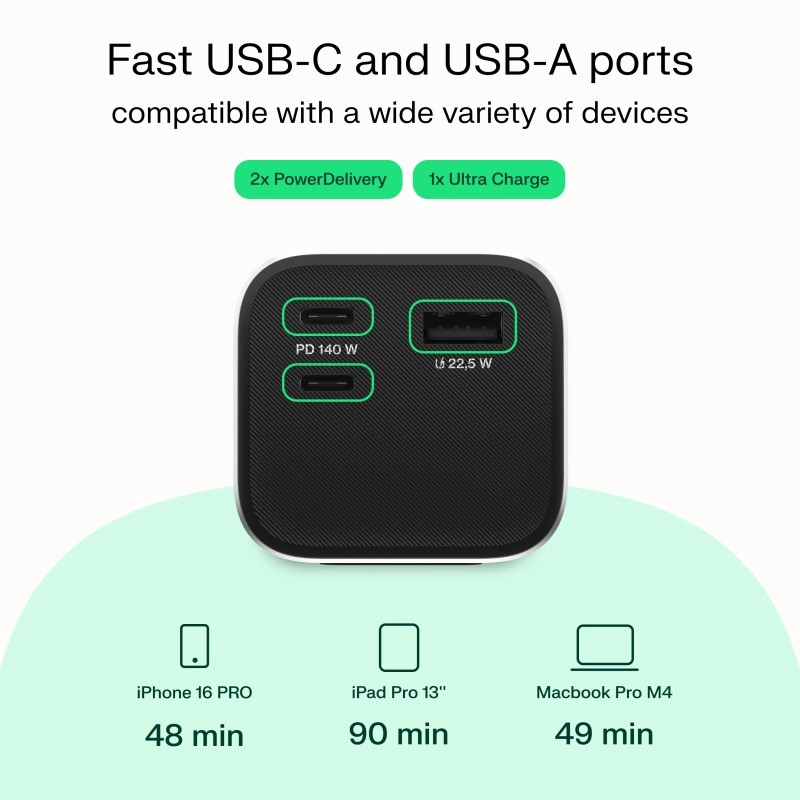 Izlazna snaga do 140 W s Power Deliveryjem omogućuje brzo punjenje kompatibilnih ultrabooka i zahtjevnijih uređaja, i to bez problema čak i istodobno.