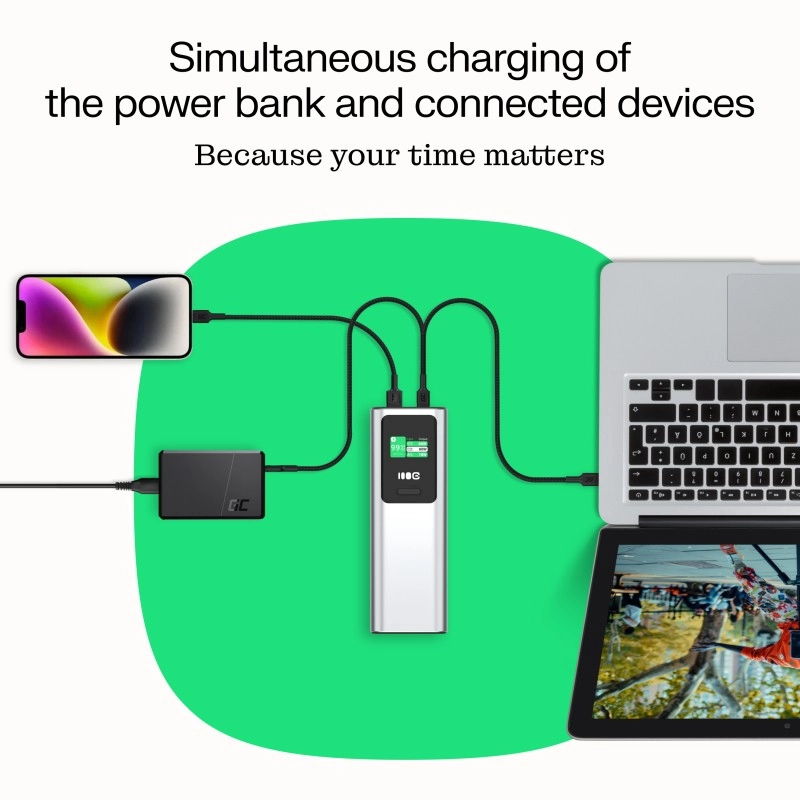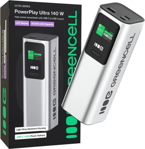 Tražite zamjenu za utičnicu na putovanjima? Power banka GREEN CELL PowerPlay Ultra kombinira ogroman kapacitet od 25200 mAh i ultrabrzo punjenje 140 W PD, pa može istodobno napajati i dva prijenosnika te više puta napuniti vaš pametni telefon ili tablet. Zahvaljujući USB‑C i USB‑A priključcima kompatibilna je sa širokim rasponom uređaja i spremna za moderne standarde punjenja.