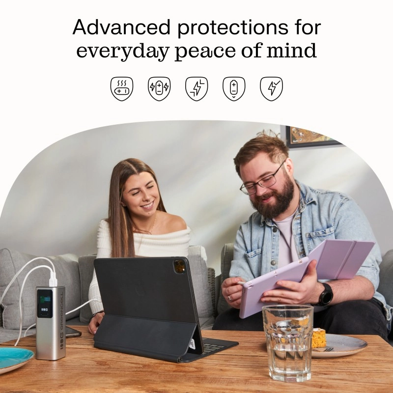 Integrirani LCD zaslon pruža ključne podatke u stvarnom vremenu: stanje napunjenosti, trenutačnu snagu, broj ciklusa, temperaturu i stvarni kapacitet. Funkcija pass‑through omogućuje istodobno punjenje power banke i uređaja – štedi vrijeme i povećava udobnost. Power banka ispunjava međunarodne zrakoplovne norme, pa je možete ponijeti i u avion.