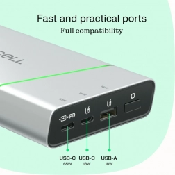 Promišljeno sučelje s dva USB‑C i jednim USB‑A priključkom omogućuje istodobno punjenje više uređaja. Metalno kućište je izdržljivo, a pritom elegantno tanko, LED indikator jasno prikazuje stanje baterije, a certifikacija „airplane ready” znači bezbrižno putovanje avionom.
