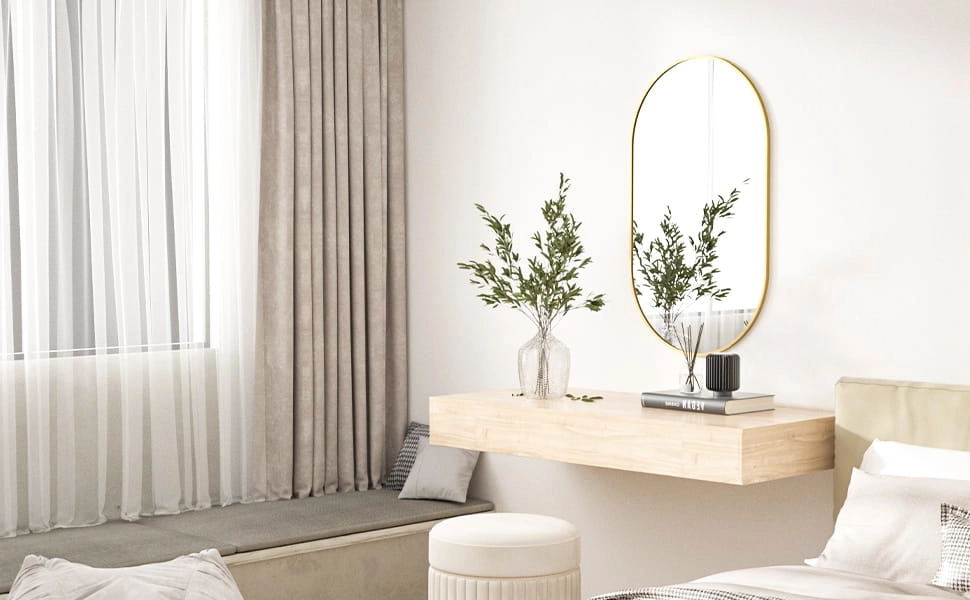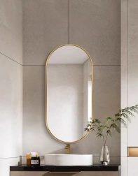 Unesite bezvremensku eleganciju u svoj dom. Ovalni oblik u kombinaciji s mat zlatnim aluminijskim okvirom naglašava industrijski karakter i pretvara kupaonicu, predsoblje i dnevni boravak u stilsko i ugodno mjesto. Zahvaljujući kvalitetnom staklu, ogledalo pruža savršen, nedeformiran odraz te istodobno vizualno povećava i prosvjetljuje prostoriju.