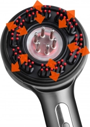 Crvene LED (630–670 nm) revitaliziraju folikule i produljuju fazu rasta, plave LED (400–470 nm) djeluju antibakterijski, umiruju i reguliraju sebum. Integrirani spremnik s dozirnim trnovima ravnomjerno raspoređuje vaš omiljeni tonik, serum ili ulje po vlasištu, čime povećava njihovu apsorpciju i učinkovitost.