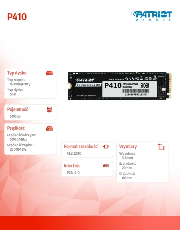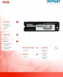 Patriot P410 moderan je PCIe 4.0 NVMe SSD u formatu M.2 2280, dizajniran za brzu odzivnost sustava i kraća učitavanja igara i programa. Zahvaljujući poboljšanom upravljanju temperaturom i grafenskoj toplinskoj površini, održava stabilne performanse i pri dugotrajnom opterećenju.
