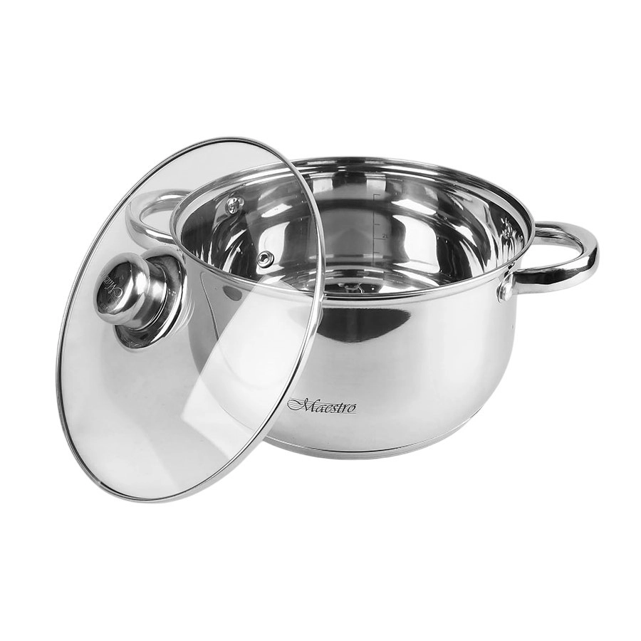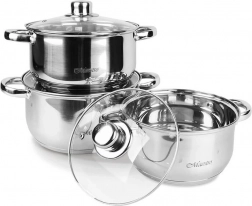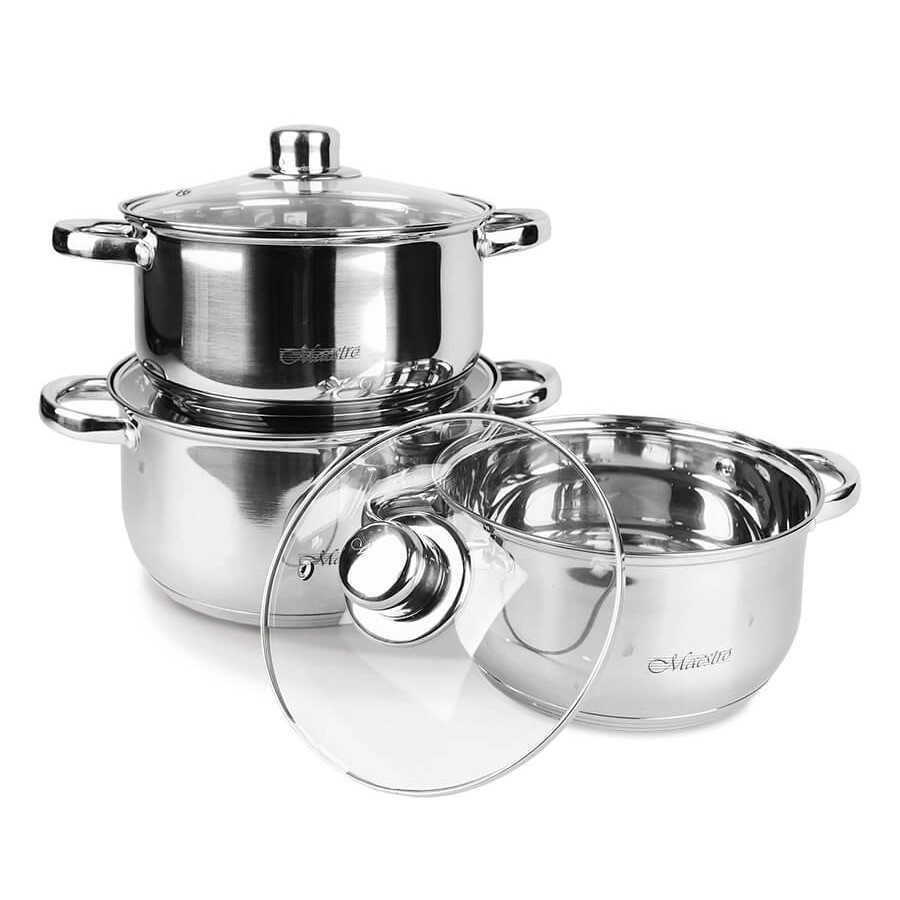 Sa 6-dijelnim setom lonaca Maestro dobivate pouzdano posuđe za svakodnevnu upotrebu. Lonci od izdržljivog nehrđajućeg čelika lako se održavaju, stakleni poklopci s otvorom za izlazak pare omogućuju kontrolu kuhanja, a višeslojno termoakumulacijsko dno štedi energiju zahvaljujući ravnomjernoj raspodjeli topline.