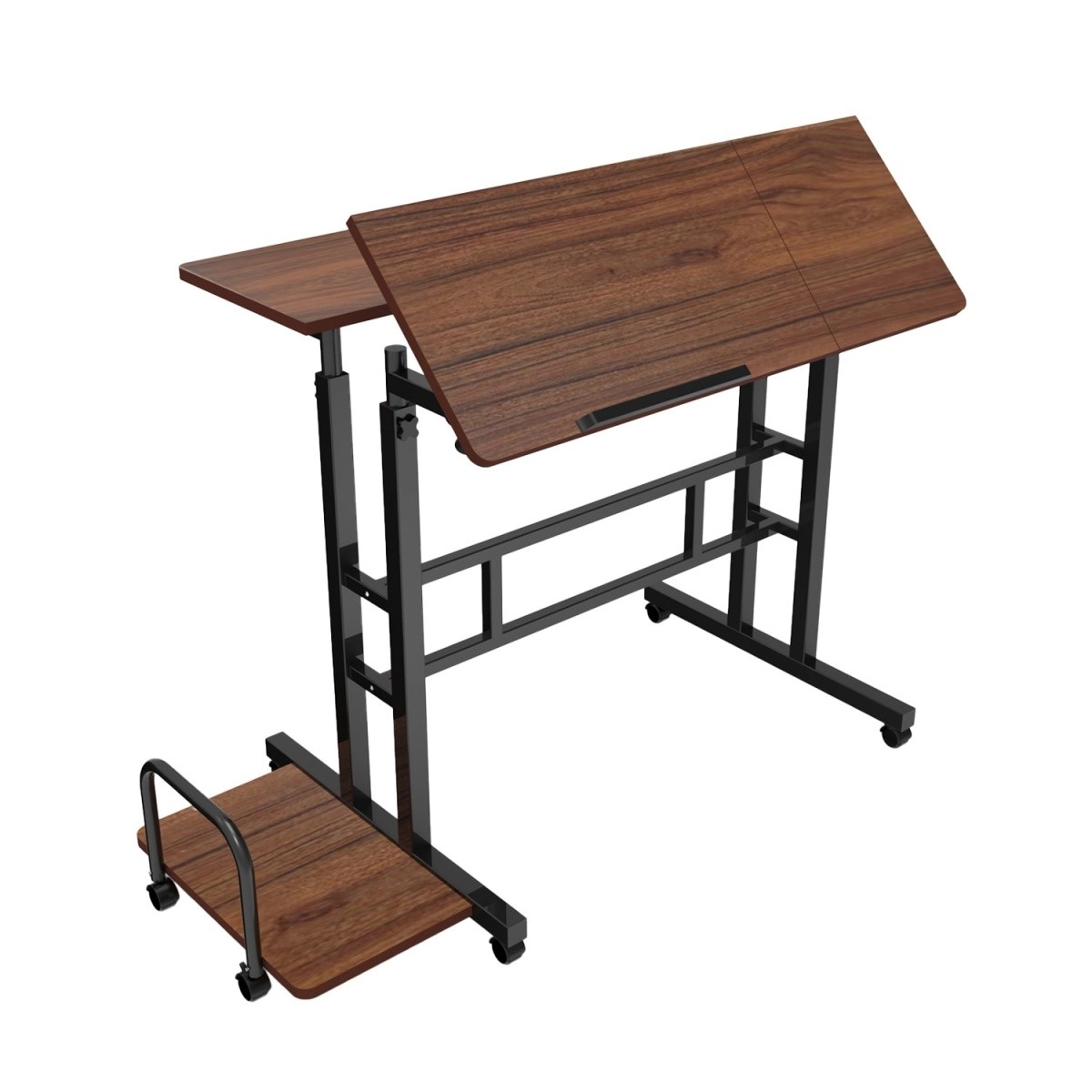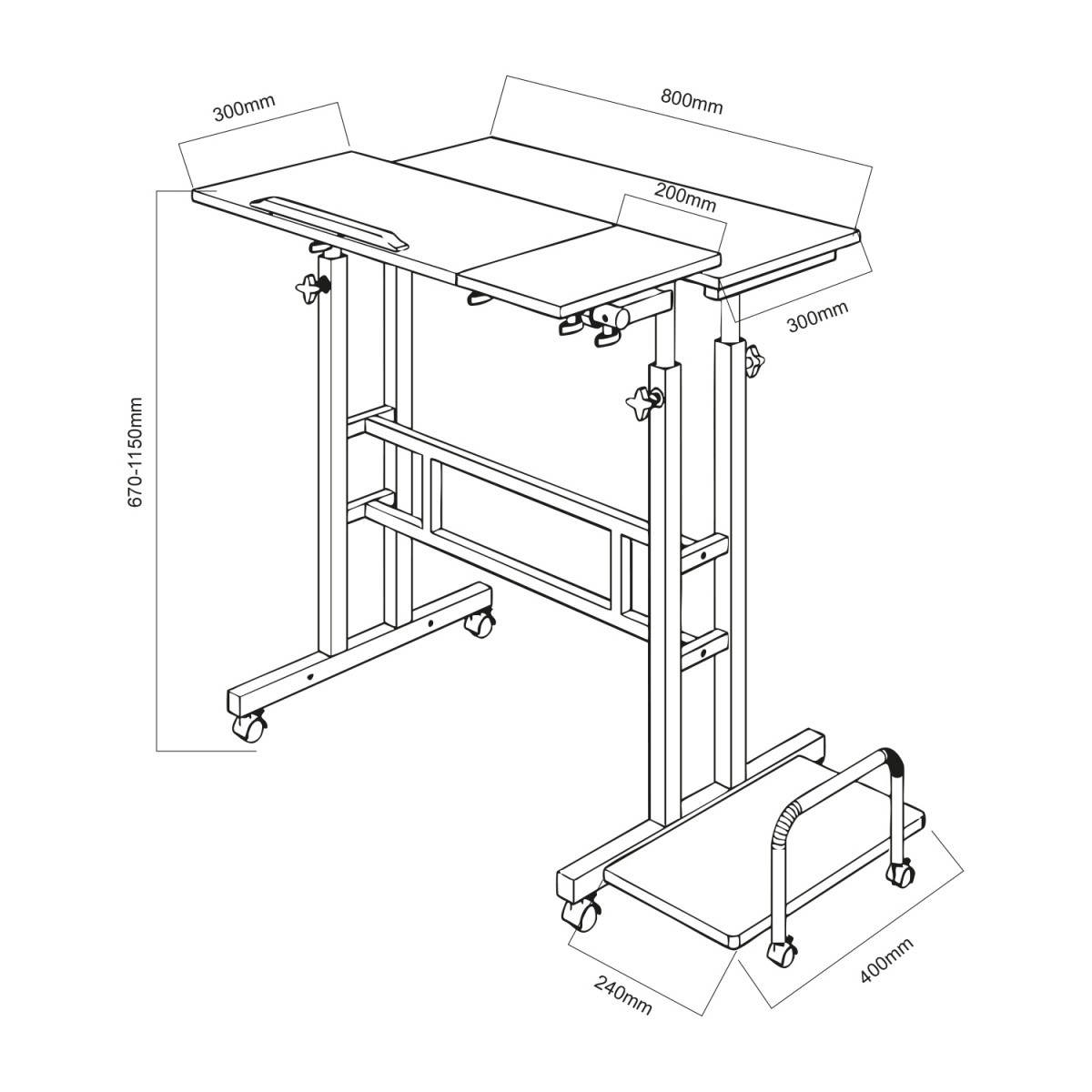 Tražite fleksibilno radno mjesto koje se prilagođava vašem radu i prostoru? Ovaj mobilni stol spaja stabilnu metalnu konstrukciju s elegantnim drvnim dekorom te nudi ugodno podešavanje visine 67–115 cm za rad sjedeći i stojeći. Prostrana radna površina 80 × 60 cm (sastavljena od dvije ploče 80 × 30 cm) prima prijenosno računalo, dokumente i dodatke, dok je bočna polica 24 × 40 cm idealna za PC kućište ili pisač.