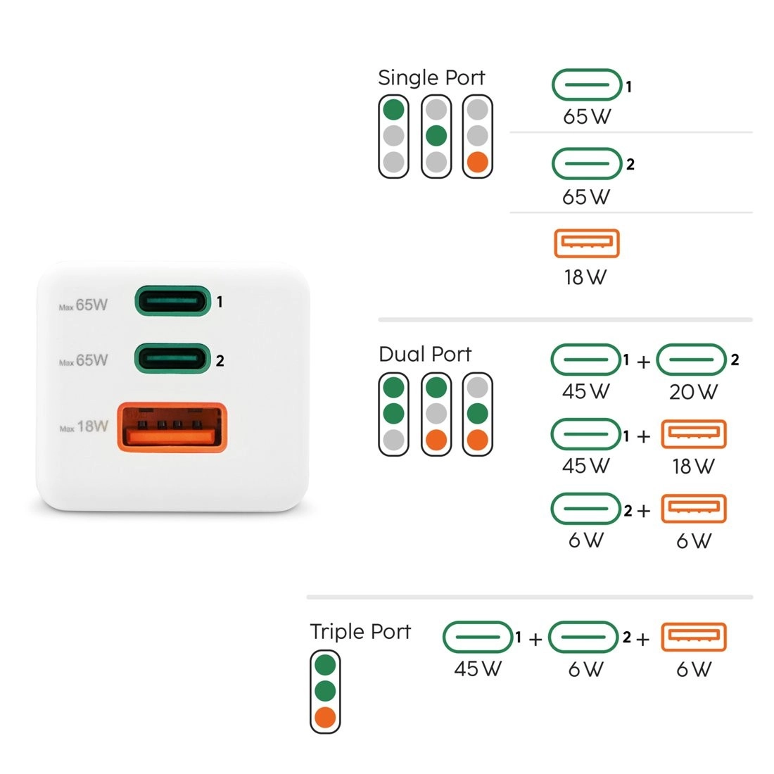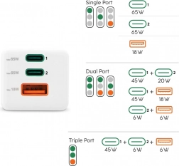 Trostruki izlaz 2× USB‑C i 1× USB‑A omogućuje punjenje tri uređaja istodobno. Integrirane zaštite od prenapona, preopterećenja, kratkog spoja i pregrijavanja, zajedno s inteligentnom detekcijom uređaja, osiguravaju sigurno i optimalno punjenje koje čuva bateriju.