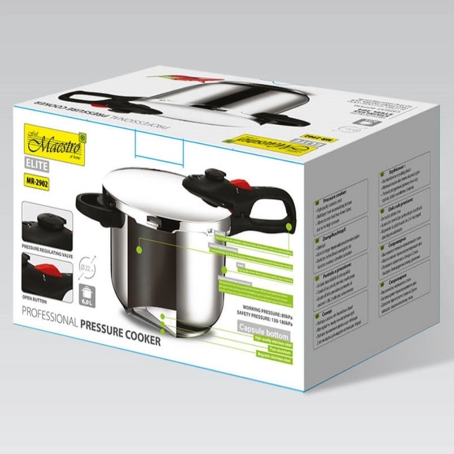 Sigurnost i učinkovitost podržava radni tlak 80 kPa i održavani raspon tlaka 130–180 kPa, koji omogućuje brzo i ravnomjerno kuhanje. Poklopac s bočnom drškom i brtveni prsten jamče nepropusnost i ugodno rukovanje.