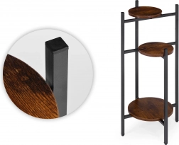 Konstrukcija od praškasto lakiranog čelika jamči otpornost na koroziju i mehaničko trošenje, dok okrugle police od iverice u dekoru drveta daju toplinu i karakter. Protuklizne nožice štite pod i povećavaju stabilnost, pa je stalak prikladan i za prometnija mjesta.