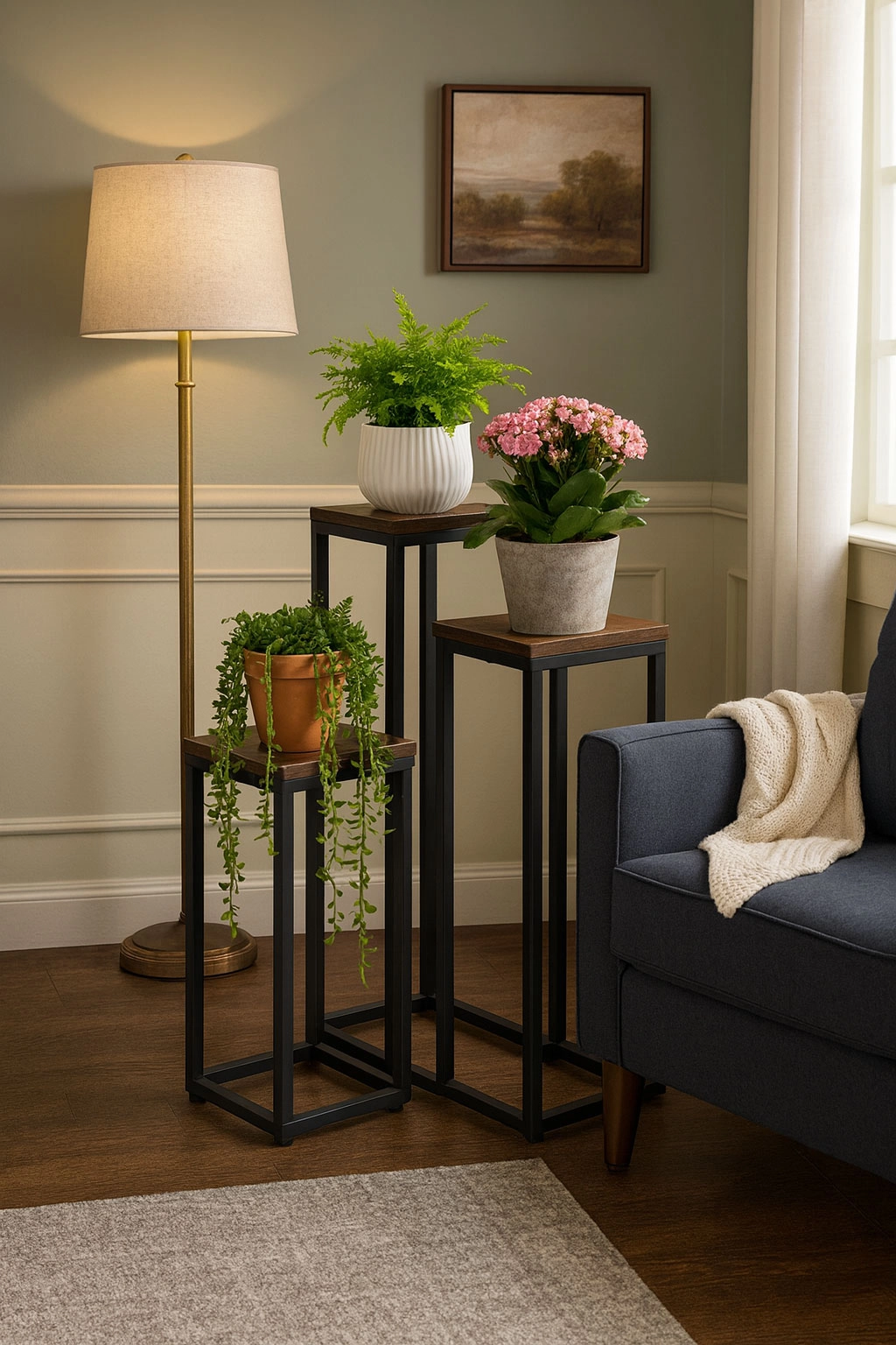 Tri praktične police omogućuju izlaganje začinskog bilja, sukulenata i visećih biljaka na različitim visinama. Tako stvarate kompaktan, pregledan i dekorativan zeleni zid bez nepotrebnog zauzimanja prostora.