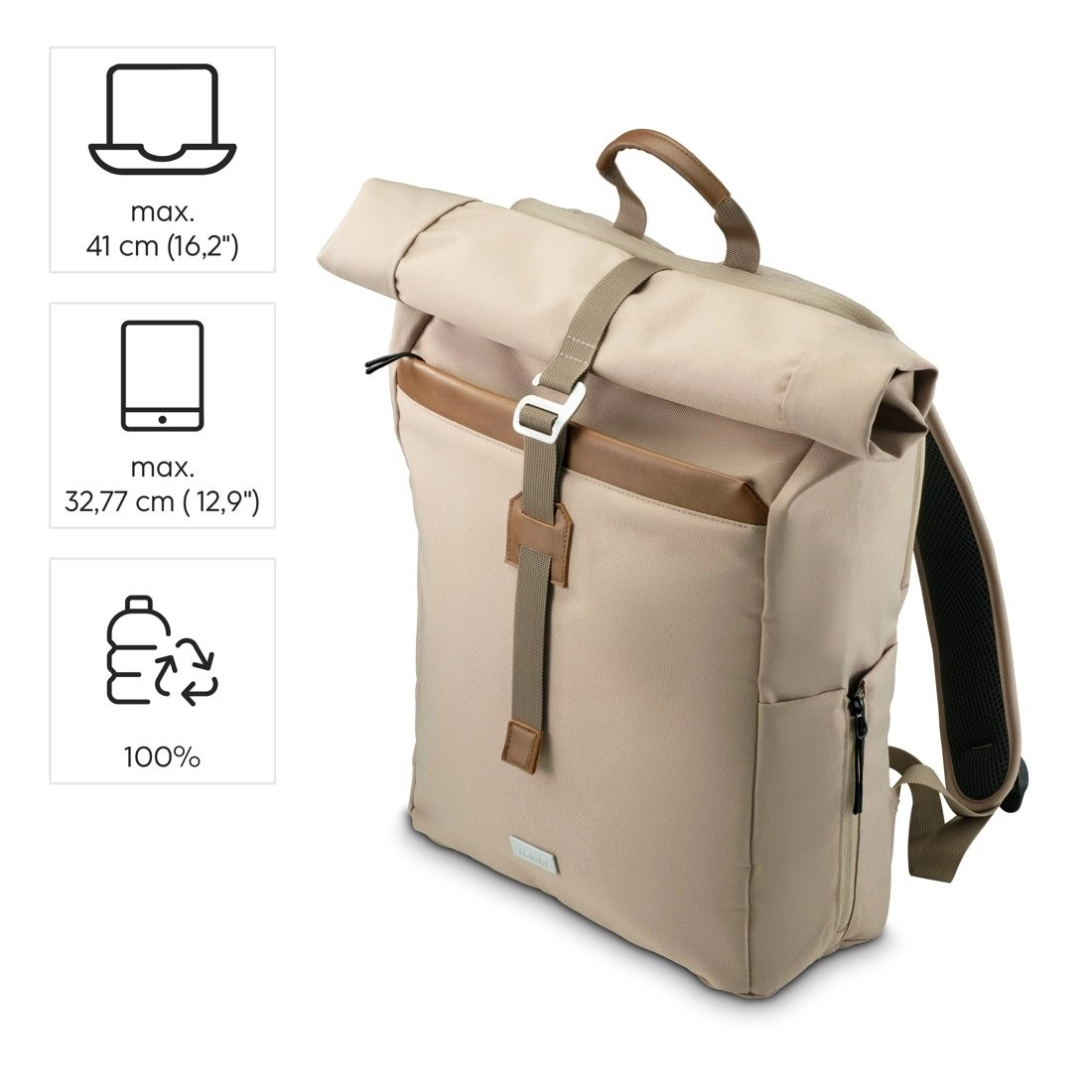 Unutarnji raspored osmišljen je za maksimalnu preglednost: ojačani pretinac za 16,2'' prijenosno računalo sa sigurnosnom trakom, zaseban džep za tablet do 12,9'' i praktični organizator za sitnice. Tu je i prednji džep za brz pristup te bočni džep za bocu. Materijal od 100% reciklirane plastike naglašava održiv karakter proizvoda.