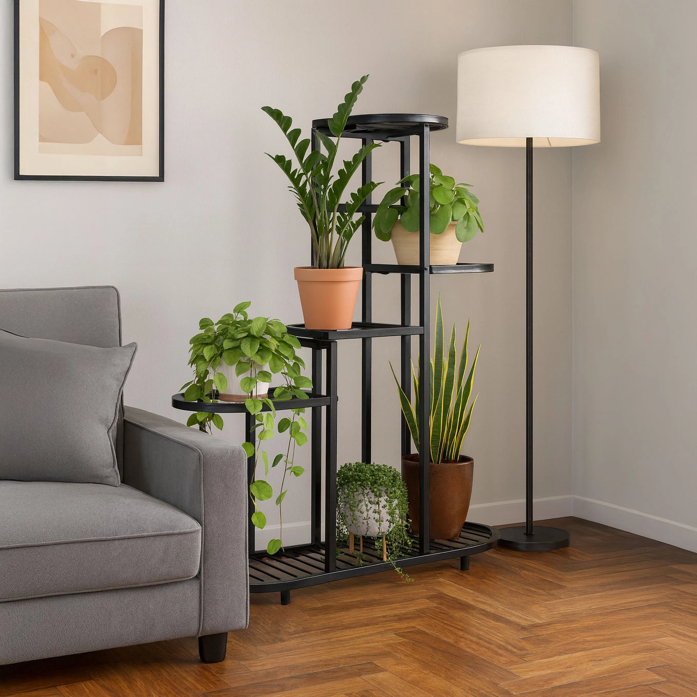 Izložite svoje omiljene biljke stilski i pregledno. Ovaj peterazinski stalak u minimalističkom stilu omogućuje elegantno aranžiranje zelenila te lak pristup zalijevanju i njezi. Univerzalan dizajn savršeno se uklapa u moderan interijer, kuhinju s začinskim biljem i reprezentativnu recepciju.