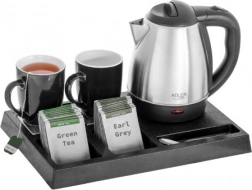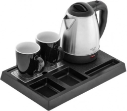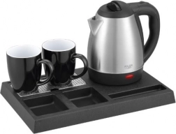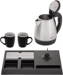 Elegantni i praktični set za hotele, pansiona i apartmane uključuje nehrđajuće kuhalo 1,2 l, stilizirani vodootporni pladanj i 2 keramičke šalice od 320 ml. Zahvaljujući preglednim pretincima za čaj, kavu i dodatke, integriranoj utičnici za kuhalo i rešetki za ocjeđivanje, održat ćete red u sobi i gostima omogućiti lak pristup toplim napitcima.