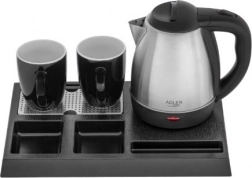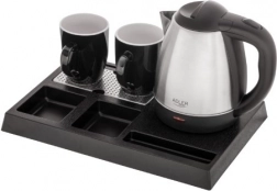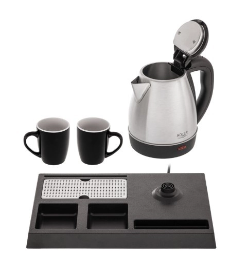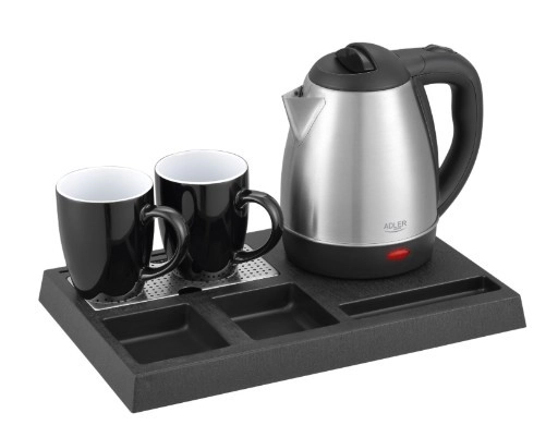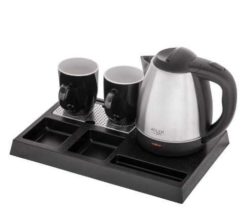 Set ADLER AD 1354 osmišljen je za profesionalnu upotrebu u smještajnim objektima. Spaja estetiku i izdržljivost: kuhalo od nehrđajućeg čelika osigurava brzo zagrijavanje vode, dok je ABS pladanj sa strukturiranim dekorom vodootporan i lako se čisti. Dvije keramičke šalice bez logotipa djeluju univerzalno i elegantno.