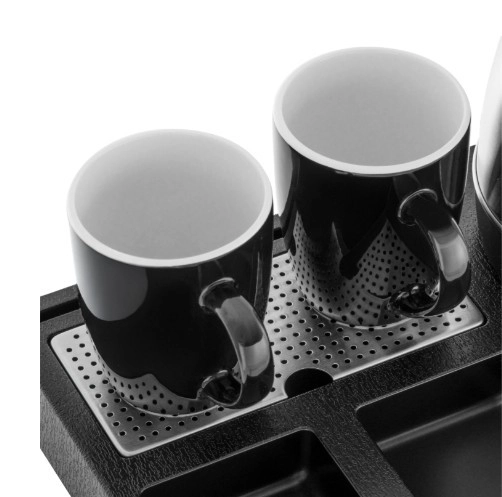 Promišljeni detalji, kao što su pretinci za vrećice čaja, kave, šećera ili vrhnja/sladila, rešetka za ocjeđivanje radi čistoće i integrirano napajanje kuhala, štede prostor i vrijeme osoblja. Praktično mjesto za žličicu/miješalicu dodatno drži sve nadohvat ruke – idealno rješenje za moderne hotelske sobe.