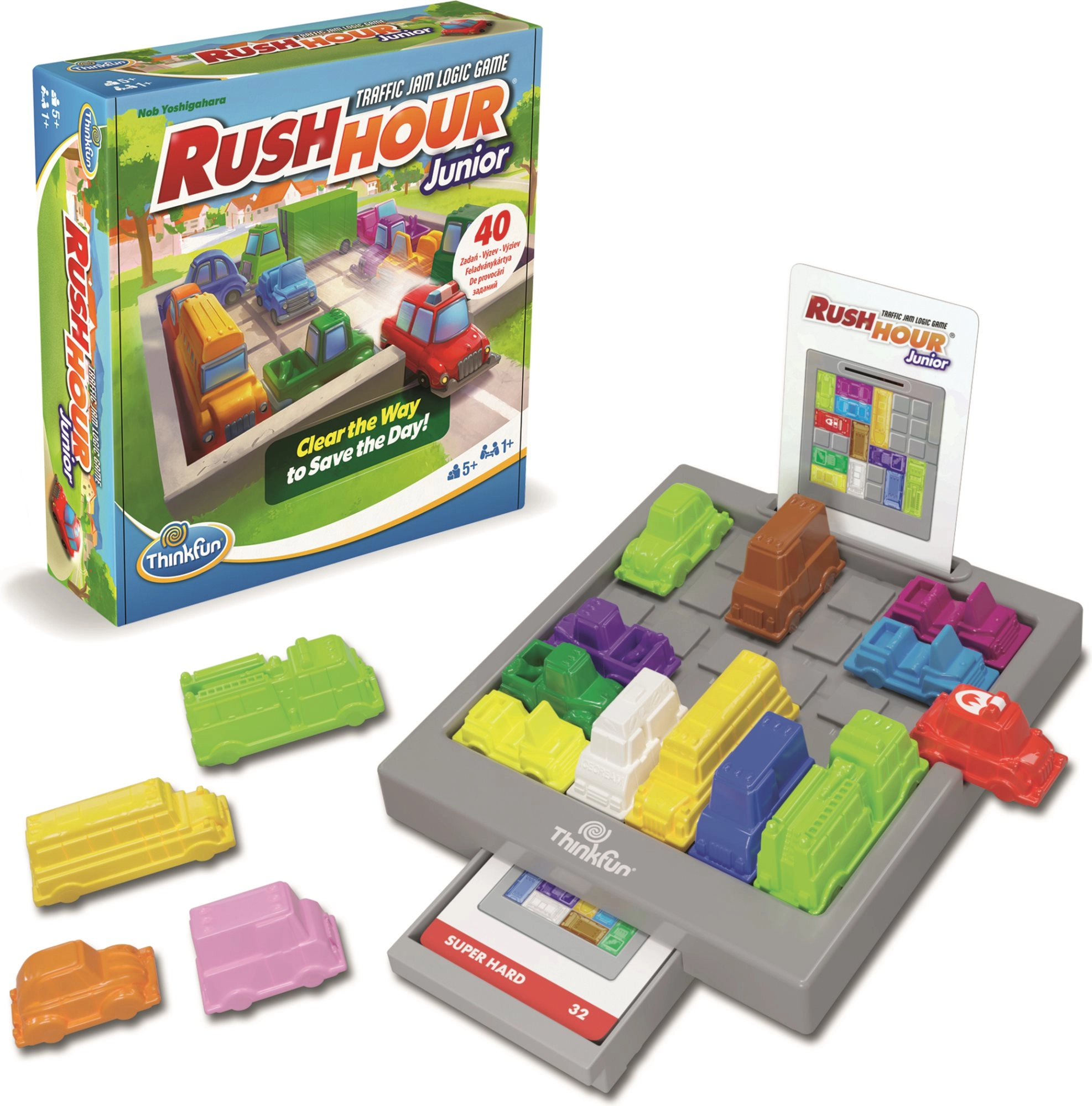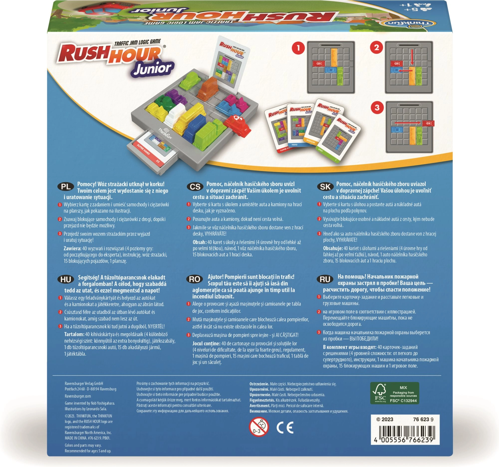 Rush Hour Junior je dječja varijanta legendarne logičke igre RUSH HOUR, prilagođena tako da bude pristupačna mlađim igračima. Nudi postupno sve zahtjevnije razine koje potiču samostalno rješavanje problema i koncentraciju. Zahvaljujući kratkim rundama, izvrsna je za igru kod kuće i na putovanjima.