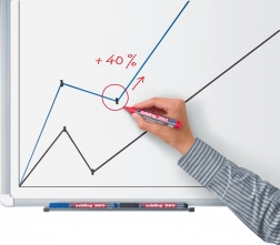 Pouzdani marker Edding 360 idealan je za svakodnevnu upotrebu u uredu, školi i kod kuće. Njegova pigmentirana tinta sa slabim mirisom bez butil acetata pruža visoku pokrivnost i ostavlja jasnu plavu liniju. Pogodan je za sve vrste bijelih ploča, kao i druge neporozne površine poput stakla, emajla ili melamina.