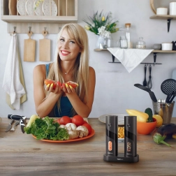Zahvaljujući USB‑C punjivoj bazi više ne morate razmišljati o baterijama – mlinci su uvijek spremni. Keramički kamenčići čuvaju aromu i otporni su na koroziju. Podešavanje gruboće omogućuje prebacivanje iz finog praha u krupnije komadiće u sekundi, pa savršeno odgovara salatama, odrescima i juhama.