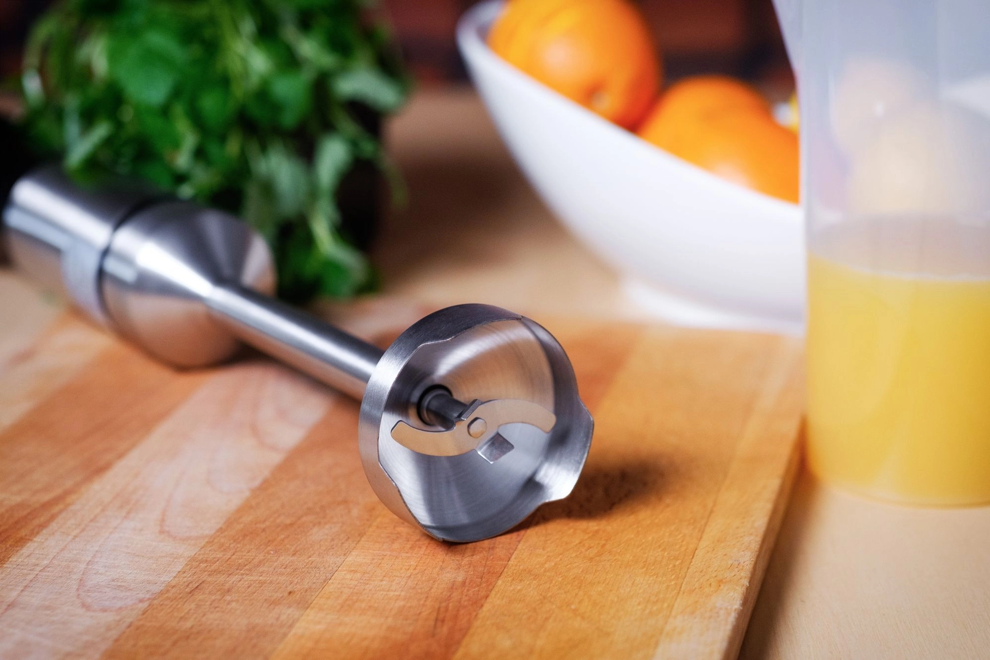 Oštrice od nehrđajućeg čelika s dvostrukom ravninom bez problema obrađuju voće, povrće i orašaste plodove. Odvojiva noga sa zaštitom od prskanja olakšava čišćenje, a ergonomska drška osigurava siguran hvat i pri duljem radu. Metlica je idealna za šlag i bjelanjke, a posuda za miksanje od 700 ml za glatke smoothieje i umake.