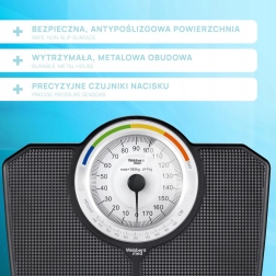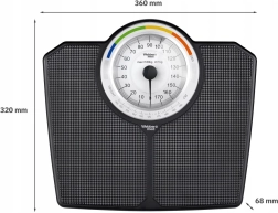 Klasična mehanička osobna vaga WEBBER s nosivošću do 180 kg nudi pouzdano mjerenje bez baterija. Velik čitljiv brojčanik s podjelom po 1 kg omogućuje brza i precizna očitanja, a obojene zone i BMI funkcija pomažu pri orientacijskom praćenju tjelesne mase. Izdržljivo izvedenje, protuklizna površina i elegantan crni dizajn odlično se uklapaju u svaku kupaonicu.