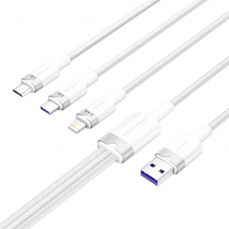 Univerzalni kabel Vention 3-u-1 omogućuje pomoću jednog vodiča istodobno punjenje do tri uređaja. Nudi brzo punjenje do 120 W, inteligentnu raspodjelu snage i prijenos podataka 480 Mb/s. Zahvaljujući izdržljivom opletu i kvalitetnim materijalima idealan je za svakodnevnu uporabu kod kuće i u uredu.