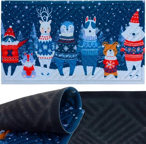Božićni otirač RUHHY spaja funkcionalnost i dizajn – razigrani zimski tisak s blagdanskim motivima dočekuje goste već na vratima, dok čvrsta konstrukcija pomaže održati čistoću u interijeru. Kompaktna veličina 75 × 45 cm savršeno pristaje ispred ulaznih vrata u domu, uredu ili trgovini.