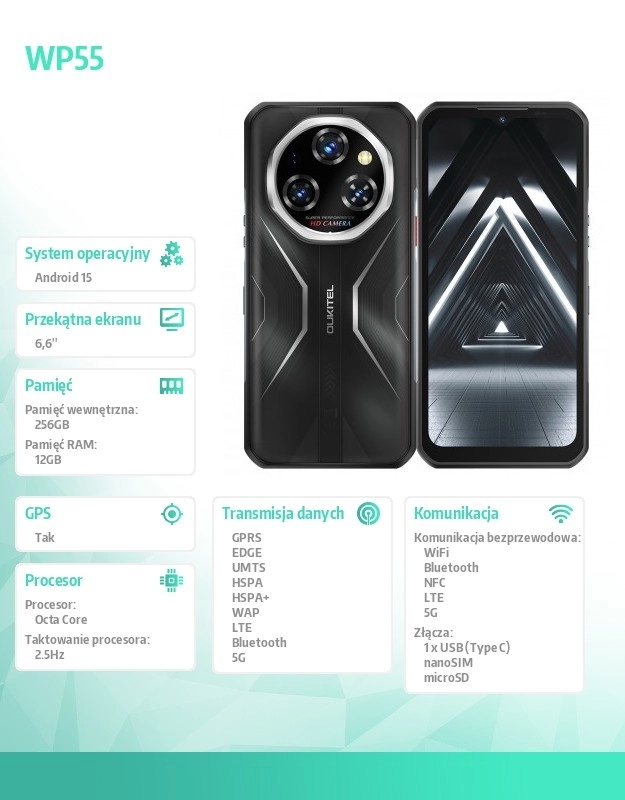 Ne nedostaju 5G, Wi‑Fi, Bluetooth 5.2, NFC za beskontaktna plaćanja i aktualni sustav Android 15. WP55 je odličan izbor za profesionalce na terenu, outdoor entuzijaste i svakoga tko traži maksimalnu pouzdanost.
