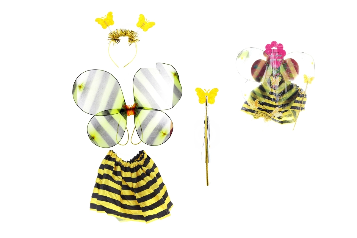 Ovaj razigrani komplet kostima pčelice u trenu pretvara svako dijete u veselu zujavu pomoćnicu. Laka prozirna krila, prugasta suknjica s elastičnim pojasom, sjajni štapić s leptirićem i obruč s treperavim leptirićima stvaraju dojmljiv izgled bez kompliciranog presvlačenja.