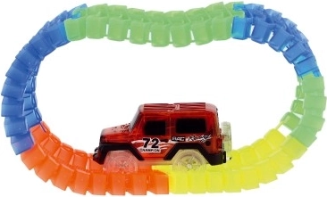 Izgradite svoju svjetleću trkaću stazu i pošaljite brzi autić na stazu! Fleksibilni dijelovi mogu se lako savijati u različite oblike, staza ima 57 dijelova duljine 72 cm, a autić s 3 trepćuća svjetla vozi na 1× AA bateriju (nije uključena). Idealno za djecu od 3 godine – zabava, kreativnost i razvoj fine motorike.