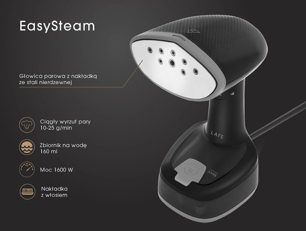 Lafe EasySteam je praktična alternativa glačalu za brzo i nježno zaglađivanje odjeće. Zahvaljujući snazi od 1600 W i stabilnom parnom učinku 15–25 g/min, lako se nosi s svakodnevnim naborima, bez oštećenja osjetljivih materijala. Nehrđajuća ploča ravnomjerno raspoređuje paru za učinkovit rezultat.