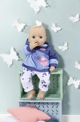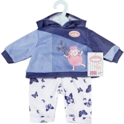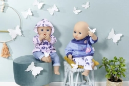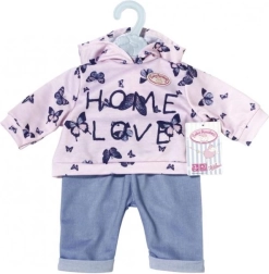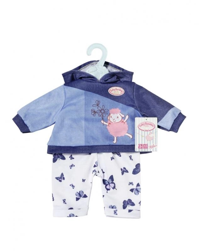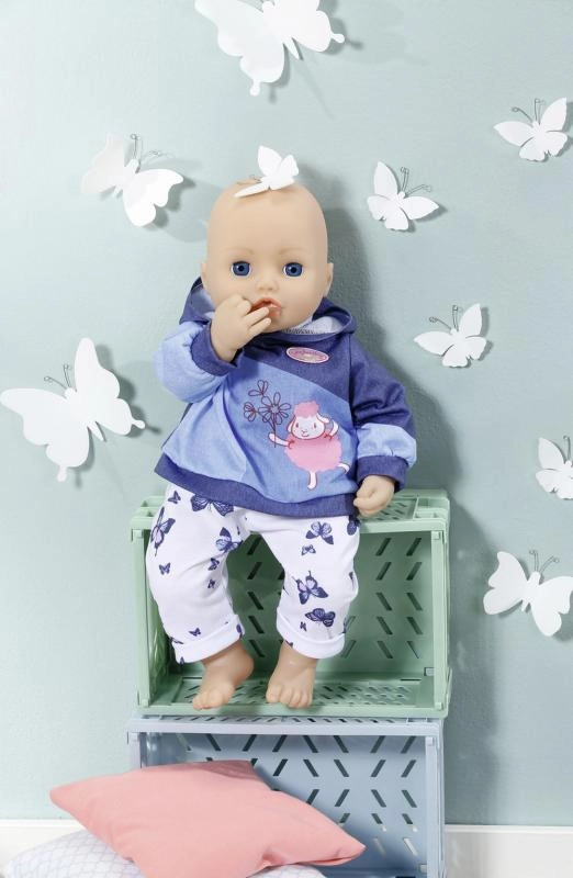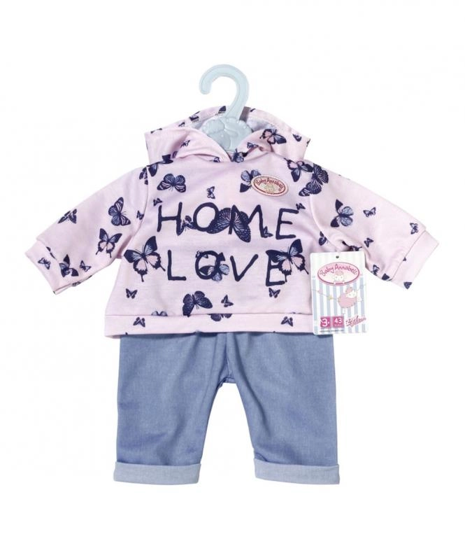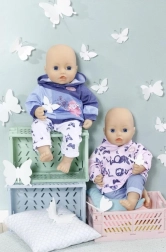 Priuštite svojoj lutki BABY ANNABELL udoban kućni outfit. Set nudi dva različita izgleda: ružičastu duksericu s kapuljačom s nježnim leptirićima i hlače u traper stilu ili plavu duksericu s kapuljačom s preslatkim motivom i udobne sportske hlače. Materijali su mekani i ugodni na dodir, idealni za svakodnevnu igru.