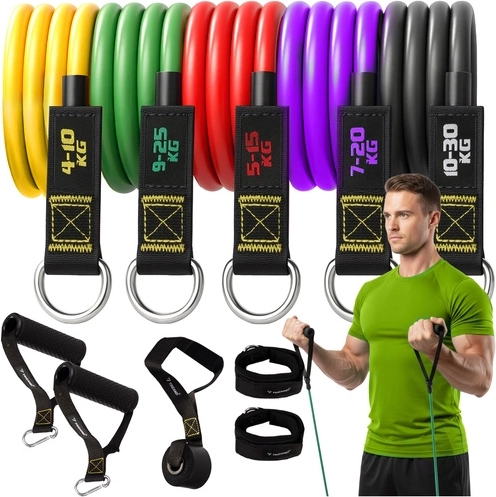 Kompletan set elastičnih traka TRIZAND za učinkovit kućni i teretanski trening. Sadrži 5 traka s otporom 4–30 kg, ručnim nastavcima, povezima za gležnjeve, graničnikom za vrata i torbicom. Zahvaljujući izdržljivom lateksu, visokoj elastičnosti i neklizajućim ručkama sigurno ćete odraditi trening cijelog tijela – leđa, ruke, noge, trbuh i gluteuse.