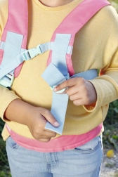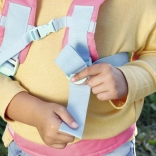 Podstavljene naramenice, prsna kopča i pojas za bok lako se prilagođavaju različitim visinama djece i drže lutku stabilno.