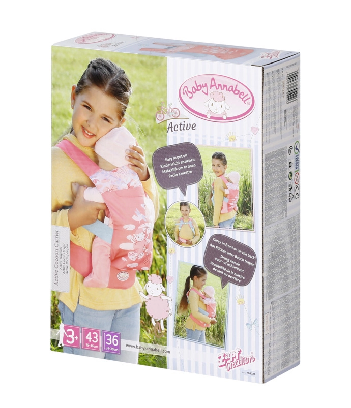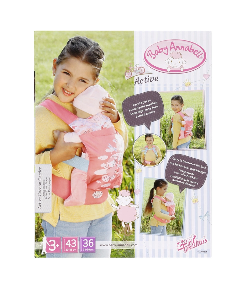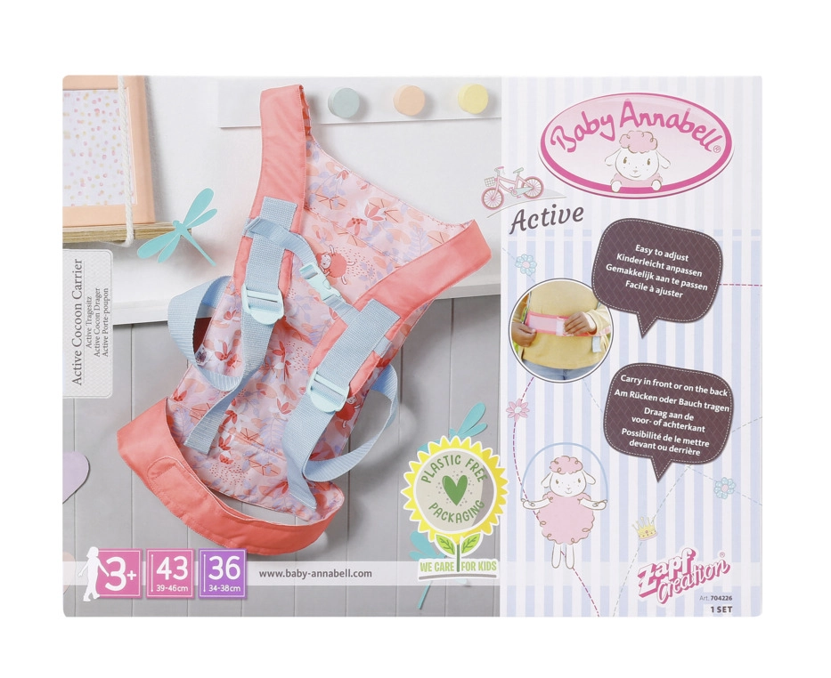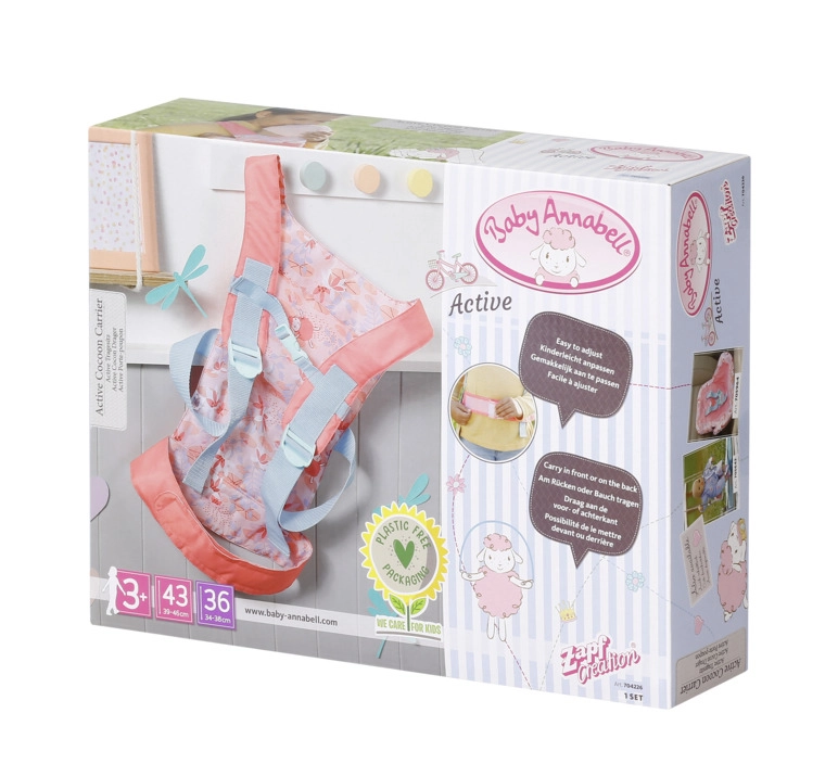 Praktična nosiljka za lutke BABY ANNABELL savršena je za male skrbnike koji žele imati svoju lutku uvijek uz sebe. Zahvaljujući mogućnostima nošenja sprijeda i na leđima te dvjema prednjim sjedećim pozicijama (licem naprijed ili prema djetetu), djeca uživaju u udobnoj i sigurnoj igri na svakom izletu.