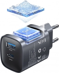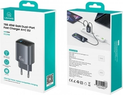 USAMS T66 s snagom 45 W koristi modernu GaN tehnologiju za visoku učinkovitost u malom kućištu. Jedan priključak USB‑C i jedan USB‑A omogućuju brzo punjenje širokog spektra uređaja – od pametnih telefona i tableta do kompatibilnih prijenosnih računala s USB‑C napajanjem.