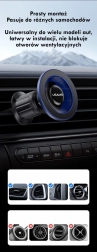 Montaža tipa hook s vijčanom regulacijom čvrsto učvršćuje držač u rešetki i sprječava njegovo otpuštanje ili ispadanje. Instalacija je brza, bez alata i kompatibilna s većinom automobila. Zahvaljujući univerzalnoj magnetskoj površini pouzdano drži telefone različitih veličina, uključujući one u zaštitnoj maski.