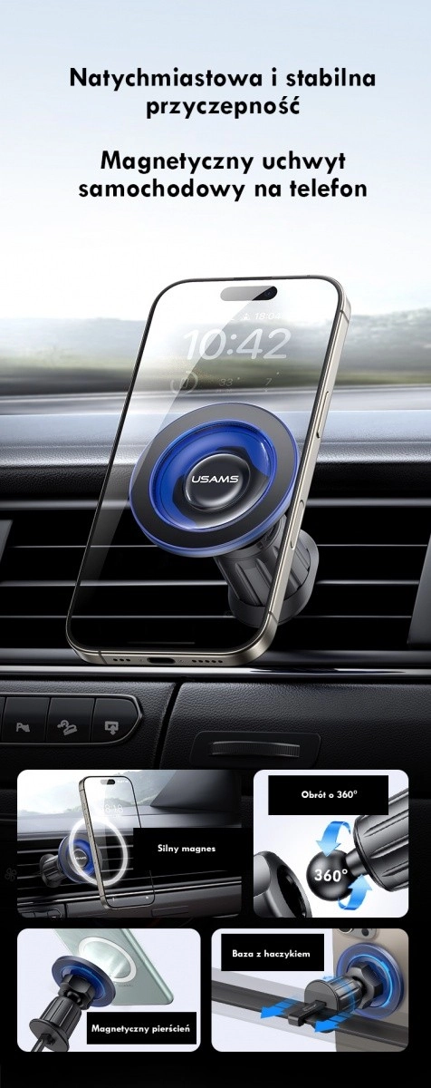 USAMS ZJ081 kombinira izdržljive materijale (akril i silikon) s promišljenom ergonomijom. Snažni magneti s sustavom automatskog centriranja osiguravaju stabilnu fiksaciju telefona, dok kuglasti zglob omogućuje glatko podešavanje u portretnom i pejzažnom načinu. Kompaktne dimenzije ne smetaju u kabini i ne opterećuju ventilacijsku rešetku.