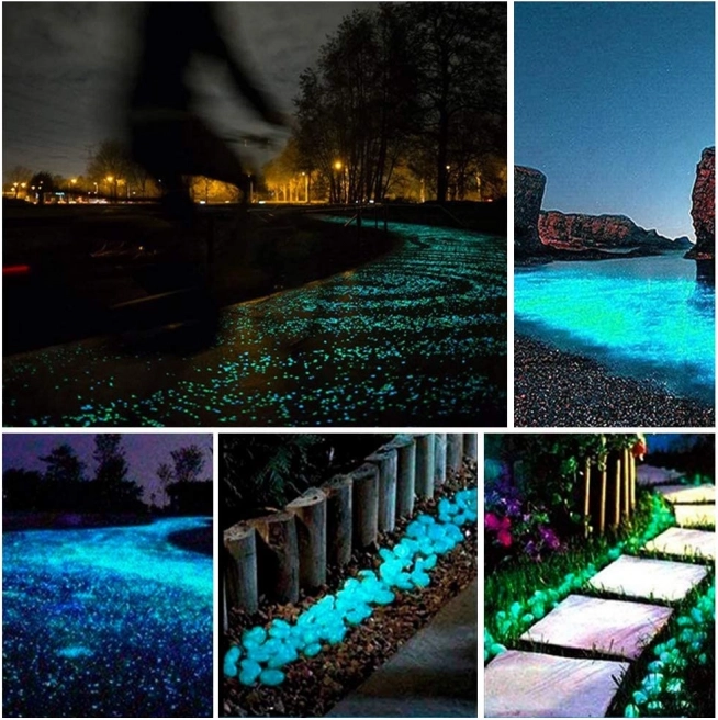 Fluorescentni kamenčići danju se pune svjetlom, a noću svijetle intenzivno plavo, naglašavajući staze, gredice i vodene površine.