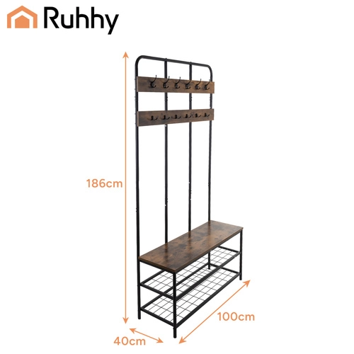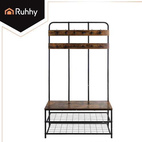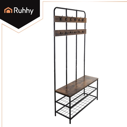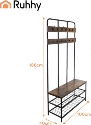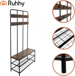 pretvorite svoje predsoblje u pregledan i elegantan prostor. Ovaj multifunkcionalni regál RUHHY nudi pametno odlaganje obuće, odjeće i dodataka. Robustan čelični okvir s praškastim premazom i MDF ploča u toplom dekoru drva osiguravaju dug vijek trajanja, stabilnost i udobnost pri obuvanju.
