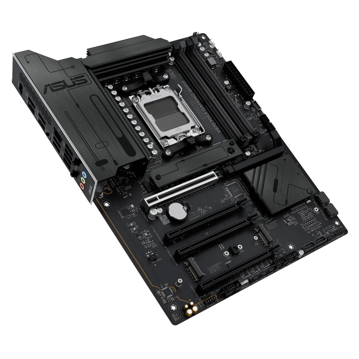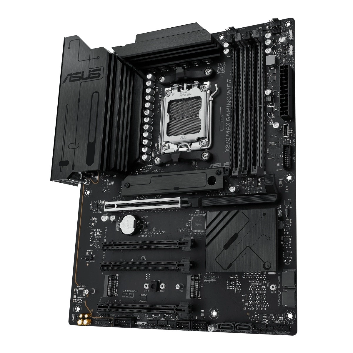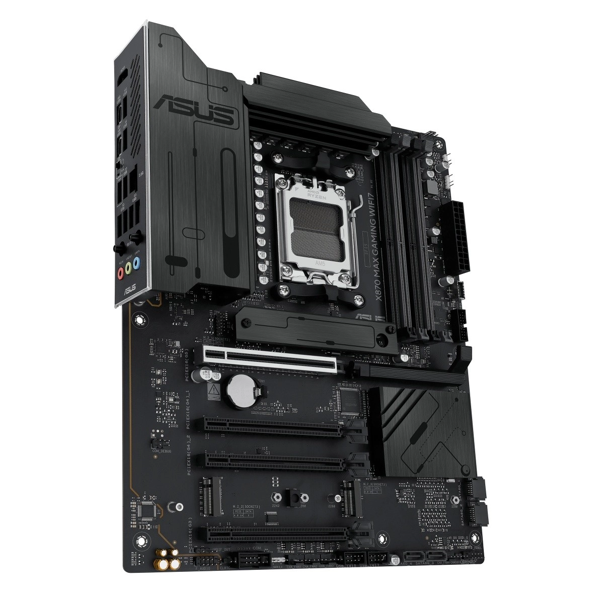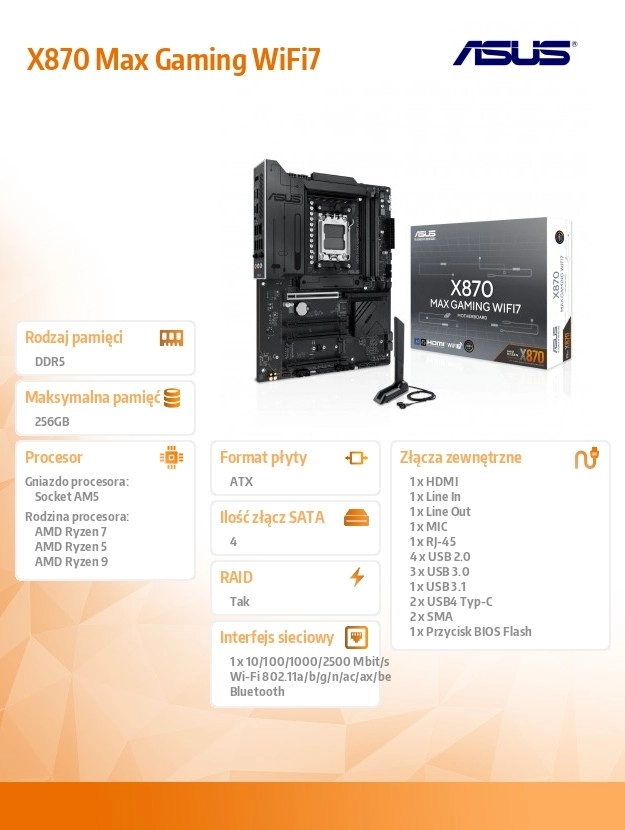 ASUS X870 Max Gaming WiFi 7 vrhunska je gaming matična ploča za platformu AM5 koja otključava puni potencijal procesora AMD Ryzen serije 9000. Spaja stabilnu naponsku sekciju, masivne hladnjake za VRM i M.2 s modernom povezivošću uključujući Wi‑Fi 7 i USB‑C kako bi pružila brzinu, stabilnost i propusnost za igre, kreiranje sadržaja i AI radne procese.