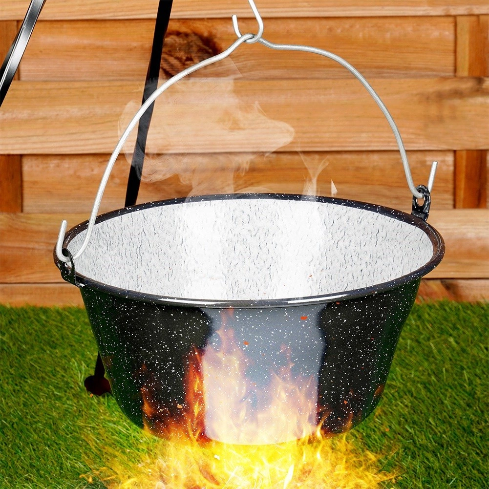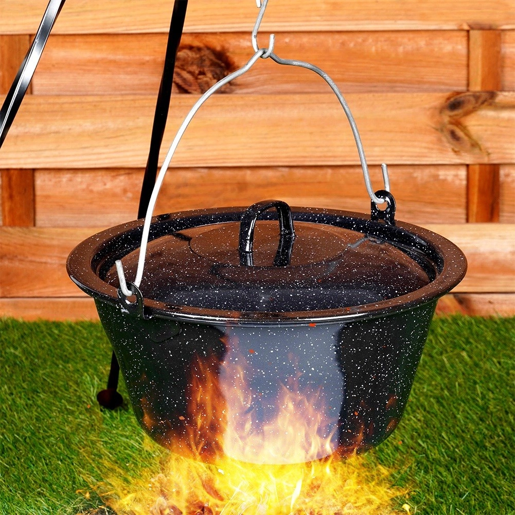 Čvrsta viseća ručka olakšava prenošenje i sigurno vješanje iznad ložišta. Savršeno za kuhanje na otvorenom u vrtu, na kampiranju i uz roštilj.